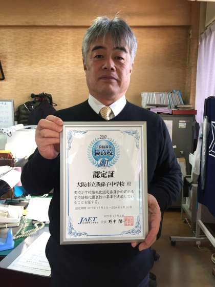 JAETより認定書が届きました。大阪市の中学校でもまだ数校しか認定されていないそうです。