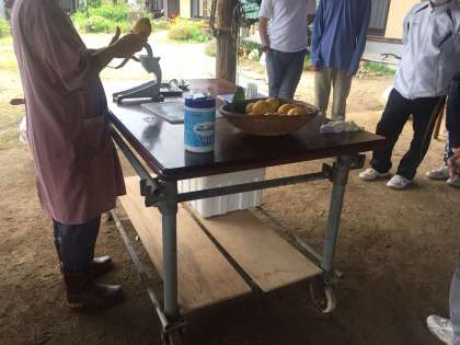 次に場所を移して、レモンジュース作りをしました。果実を搾って炭酸や水、お湯などを入れて、シロップを混ぜてできあがりです。