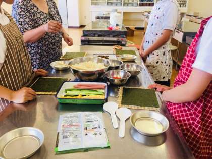 酢飯が冷めたので、巻き始めます。まずは先生のお手本から。