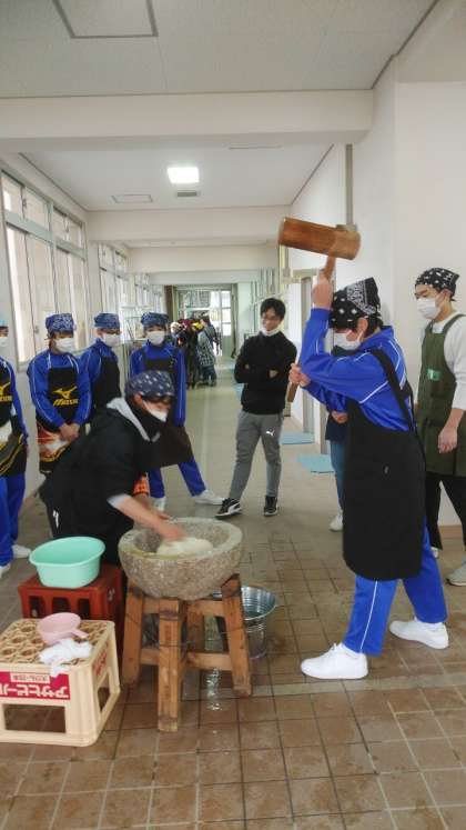 12月15日(土)長居小学校の土曜授業において、お餅つき大会が行われました。保護者のみなさんや地域の方々が多数お手伝いに来ていました。その中に今年は我孫子中学校体操部も参加しました。お餅をついたり丸めたりと楽しく参加させていただきました。