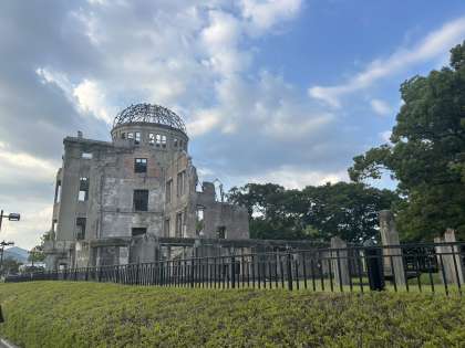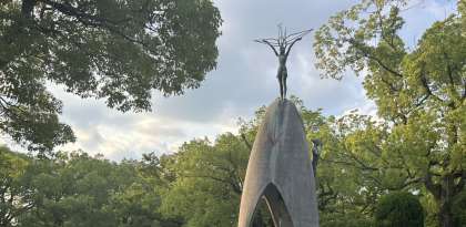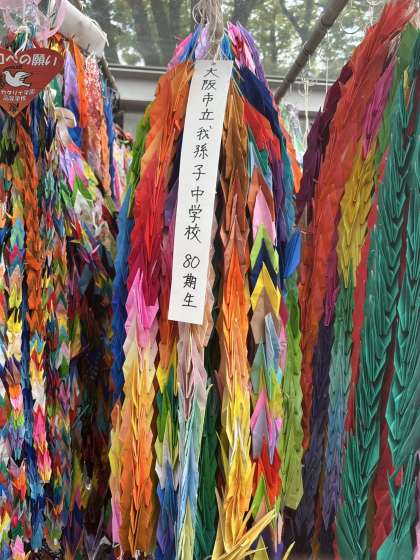学習の一環として、生徒一人ひとりが折り紙に平和への願いを書き、心を込めて折り鶴を折りました。完成した折り鶴は合計で500羽になり、本校の先生が本日、広島平和記念公園の「原爆の子の像」へ捧げました。