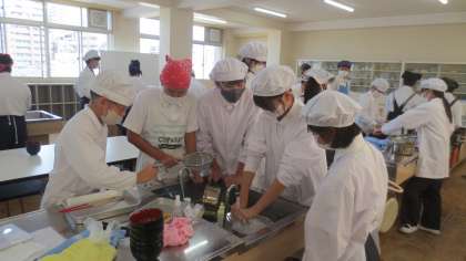 2,3限目、1年1組の家庭科の授業で、調理実習を行いました。