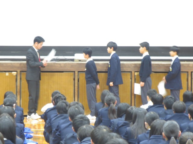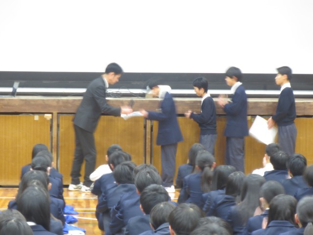 全校集会で陸上部の表彰がありました。