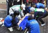 我孫子中学校での活動です。 案内表示を貼り、心臓マッサージの練習をしています。