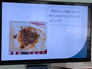 今日の献立はビビンバです。 1年生が喫食する給食室では、見本の展示の他、液晶モニ...