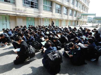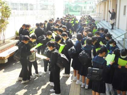 4月8日(月)、昨夜の雨も上がり、正門では生徒会執行部のメンバーが「あいさつ運動」する中、元気に子どもたちが登校して来ます。2.3年生は今日がクラス発表。配付されたプリントを見て「やったー!」と、歓喜の声があがっていました。いよいよ新年度のスタートです。