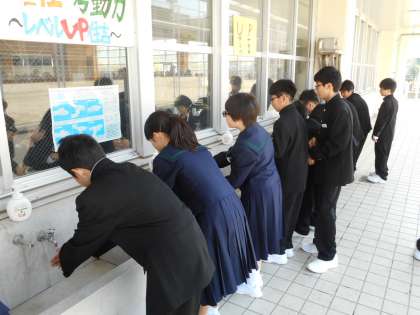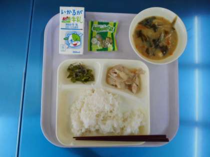 4月9日(火)4限終了後、昼食ホールに子どもたちが集合し、今年度最初の給食です。まずは手洗い、配膳、学級単位で「いただきます」。今日のメニューは、豚肉のおろしじょうゆかけ・じゃこピーマン・まっ茶大豆・みそ汁・ご飯・牛乳です。1学期中は小学校からの配缶です。給食調理員さんに感謝して「ごちそうさまでした」。