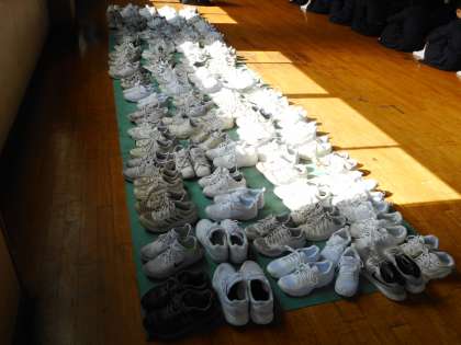 4月11日(木)、毎週木曜日は「3年生の学年集会」の日。登校後、講堂に集合し先生からの話や各委員会からの連絡を行います。今日は最初ということで、3年生としての心構えや修学旅行についての話がありました。はきものがそろっているので、3年生全員の心もそろっていることでしょう。