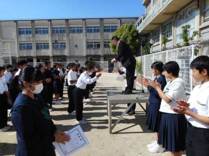 5月7日(火)、澄み切った青空のもと、全校集会・認証式を行いました。子どもたちは、10日間の休みが終わり「おはようございます」と元気に登校。校長先生からは「新しい時代の生き方」についての話がありました。その後、新しい生徒専門委員会の代表者に認証状が手渡されました。学校・仲間のために活躍することを期待しています。