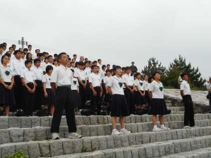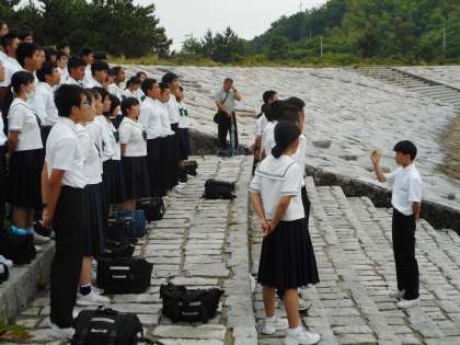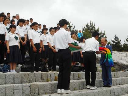 6月4日(火)、小雨もあがり「平和セレモニー」の開始です。黙とう、続いて「平和宣言」を高らかに読みあげます。最後の一文『平和ということがどういうことなのか 深く考え 当事者の一人として 一切の差別を許さず 本当の平和を実現することをこの地で宣言します』。最後に「世界がひとつになるまで」を全員合唱し、館長さんやガイドの皆さんに自分たちの思いを伝えセレモニーは終了。平和への決意を発信した73期生でした。