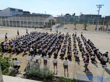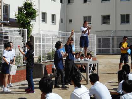 6月3日(月)、今日から6月。全校集会で、体育委員会のメンバーが、10月実施の体育大会の団決めを行いました。学年ごとに、学級担任の先生が箱から色玉を取り出し「いち、にのさん」で披露。生徒からは大きな歓声があがっていました。