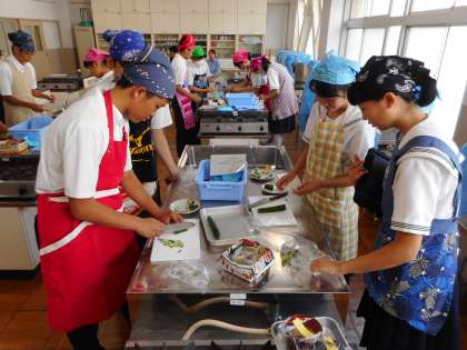 6月12日(水)1.2限、2年2組家庭科の授業。技術科との分割授業なので生徒数は半分です。目標は「包丁の使い方を知り、いろいろな切り方ができるようになる」。輪切り、千切りなど7種類の切り方を「きゅうり」で実践します。カットした7種類きゅうりを皿に乗せタブレットで写真撮影。各家庭での調理時に実践してみましょう。