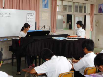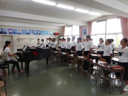 6月18日(火)5限、1年2組音楽科の授業。今日は校歌を歌う実技テスト。全体練習の後、一人一人ピアノの横で校歌を歌います。「声の大きさ」「曲想に合った表現ができている」など5項目で評価します。聞いているみんなは、鑑賞審査表に聞いた感想や評価を記入していました。大きな声でしっかりと歌えていました