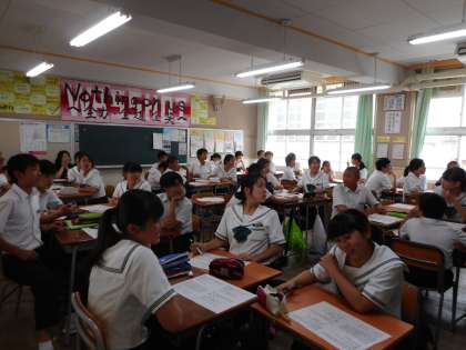 7月4日(木)6限、3年1組食に関する指導。小学校の栄養教諭に「食品表示を正しく知ろう」をテーマに授業を展開いただきました。加工食品の表示にある「アレルギー物資について」「遺伝子組み換えでないの意味」「賞味期限と消費期限の違い」などを学びました。購入する食品を正しく知る情報源となっていることをこれからの生活に活かしていきましょう