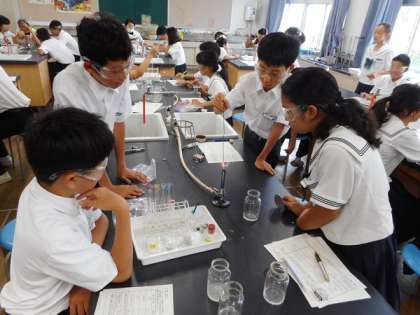 7月9日(火)1限、2年1組理科の授業。次時の顕微鏡実習に向けた準備。植物の細胞の特徴と染色する染色液の学習。1年2組理科の授業。理科室での実験。手触りや水への溶け方、燃焼させて「白い粉末」がどんな物質であるのかを調べます。実験や実習を通して、理科への興味関心が高まり、学習意欲の向上につながればと考えます。