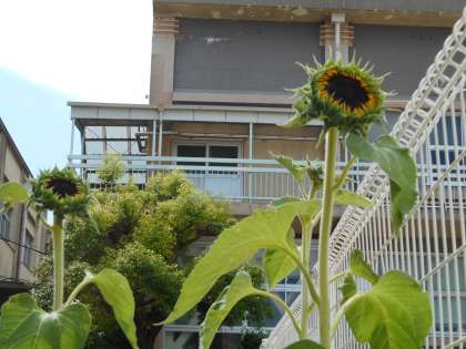 7月30日(火)、連日猛暑日が続きます。家で「ぐったり」としている皆さんも多いことでしょう。園芸部が栽培している「ひまわり」は空を仰いでいます。「プチトマト」は真っ赤な実をつけ、「オクラ」は収穫時期を過ぎ大きく成長しています。植物はたくましく成長しています。