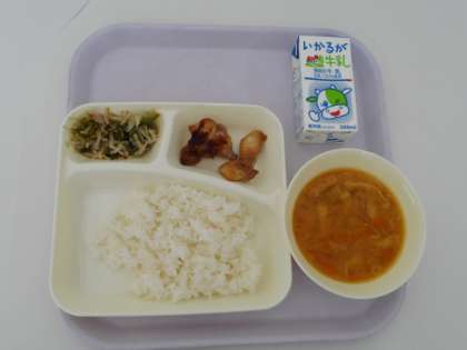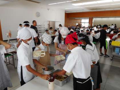 9月2日(月)、2学期がスタートとして一週間が過ぎました。給食のシステムが変わりましたが、子どもたちは配膳準備にも慣れてきたようです。今日のメニューは、鶏肉の照り焼き、野菜いため、みそ汁、牛乳、ご飯。むし暑い「給食ホール」でしたが、美味しくいただきました。
