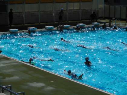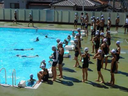 9月10日(火)5限、2年1.2組保健体育科の授業。男子は、背泳ぎのタイムを計測中。頭を打たないように、友だちがゴール前でビート板を振って合図を送っています。女子は、平泳ぎの練習に余念がありません。水泳の授業は今週一杯で終わりです。(3年生はすでに終了)