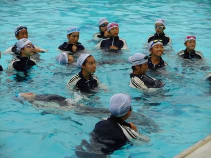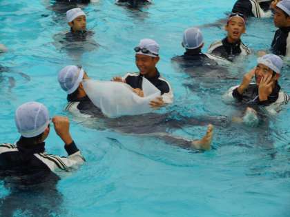 9月13日(金)1限、2年生1.2組の保健体育科の授業。小雨降る中、2年生最後の水泳の授業は「着衣泳」です。不意に海や川に落ちた時、呼吸を確保し救助されるまで浮き続ける方法を学びます。また、手近にある物(ペットボトルやビニール袋など)を利用し投げ入れる(救助)方法も学びました。これからの授業は、体育大会の練習となります。
