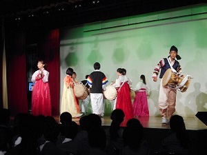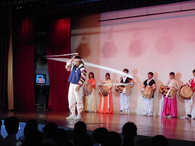9月20日(金)、人権文化研究会・和太鼓チームの演奏。和楽器、太鼓を打って「華あかり」「三宅」等を演奏。お腹まで響く迫力のある演奏でした。国際クラブ・テヤンの会は「プンムル」を披露。韓国・朝鮮の楽器、チン・ケンガリ・チャング・プクが奏でる音楽と踊り。軽快なリズムに合わせたヨルトゥバル(帽子に付けた長い紐を回す)は躍動的でした。