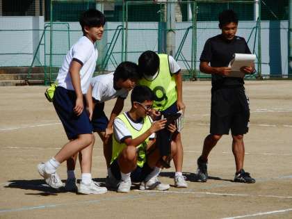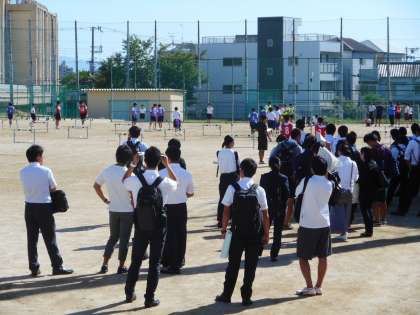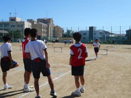 10月9日(水)、本校で大阪市の保健体育科の先生が集まり、公開授業・研究討議が行われました。給食終了後、2年1.2組の男子生徒がハードル走の授業を公開。200名ほどの先生が見守る中、普段通りの学習を発表できました。その後、講堂において授業に関する討議を行いました。 先生たちも授業力の向上に努めています