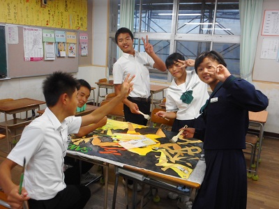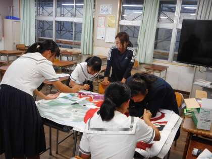 10月10日(木)、放課後の教室。各学級「学級旗」の作成に取り組んでいます。所属する団の色に合ったデザインを工夫しています。例えば、赤団の学級旗のデザインは「ダルマ」。限られた時間で頑張っています。