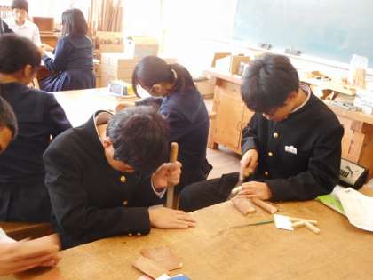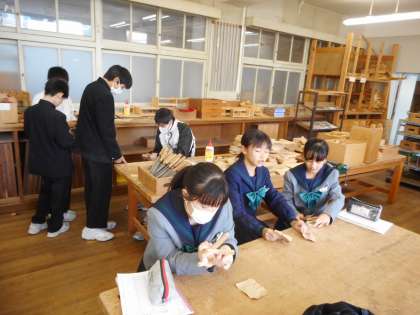 12月10日(火)5.6限、1年3組技術科の授業。(1学級を家庭科と技術科で2分割しています)デザインを考え、木材を加工する作品づくり。工程は終盤で、やすりやサウンドペーパーで作品を磨いていました。