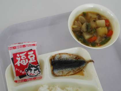 2月4日(火)、今日は「立春」。一日遅れになりましたが今日の給食メニューは「節分の行事献立」。「いわしのしょうがじょうゆかけ」と「いり大豆」が提供されました。昨日は、各家庭で「鬼は外、福は内」と言って豆まきをしたり、年の数だけいり大豆を食べましたか? 最近、いわしの頭をヒイラギの枝に刺して、家の玄関に立てる風景を見なくなりました。