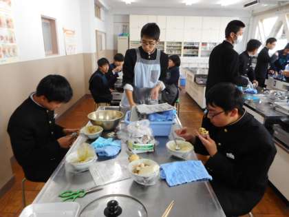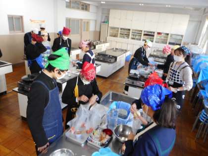 2月19日(水)1.2限、2年2組家庭科の授業。先週に引き続き、災害時に活用できる「調理実習」。メンバーは、先週のこの時間、技術を学習していた生徒たち。器を更に汚さない・調理時間の短縮などの工夫が。より効率的な安心安全な調理実習をめざし、授業改善が図られていました。