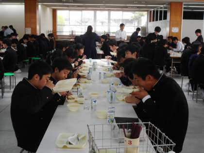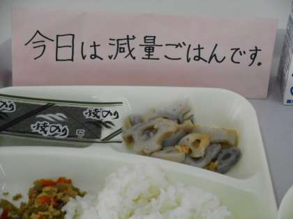 2月25日(火)、今日の給食メニューは、鶏ごぼうご飯、焼きレンコン、みそ汁、焼きのり、牛乳、ご飯です。炊き込みご飯やまぜご飯のときは、米の使用量を減らした「減量米飯献立」となります。おかわりしたり、おしゃべりしたりと、楽しくお腹一杯になりました。「ごちそうさまでした」。