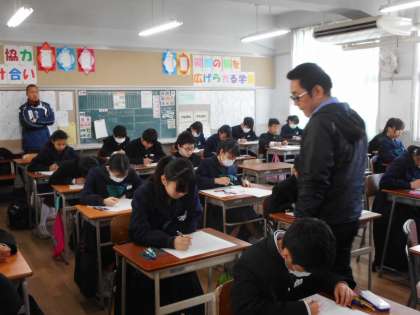 2月27日(木)、冷え込む朝になりました。1.2年生は「学年末テスト」の2日目。教室では、真剣に問題に取り組む姿が。明日が最終日、家庭学習頑張りましょう。提出物は期限を守ること。