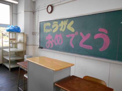 ※掲載させていただいた写真は、上:中央棟校舎と南館校舎、中:上グランドの近くに咲く矢車草、下:新入生を向かい入れた1年生の教室です。