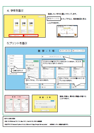 つきましては、学校より配付させていただく課題に加えて、必要なご家庭は添付しております「ご利用ガイド」を参考にご活用ください。なお、利用にはユーザーIDとパスワードが必要です。利用される方は、学校までお問い合わせくださいますよう、お願い申しあげます。