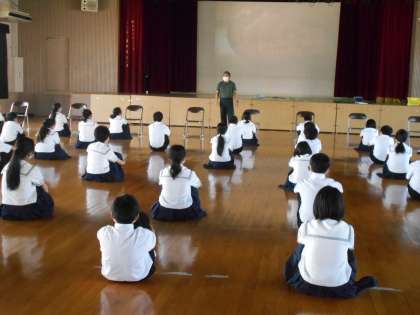 先週から始まった分散登校も、2週目を迎えました。引き続き、教科授業の様子を掲載させていただきます。下の写真は、1年生の講堂での学年集会の様子です。(学年集会も、ソーシャルディスタンスに配慮して、十分に間隔をとっての整列です。)