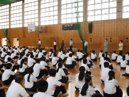 <写真上>始業式で、今年度着任された先生方を紹介している様子です。