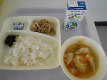 ごはん、豚肉のごまみそ焼き、すまし汁、のりの佃煮、固形チーズ、牛乳です。