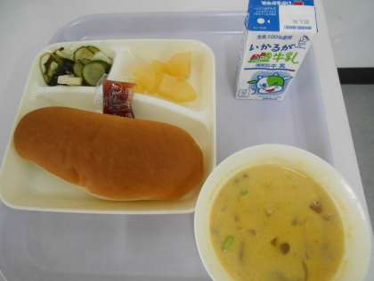 本日の献立は、コッペパン、イチゴジャム、かぼちゃのクリームシチュー、ミックス海藻のサラダ、りんご、牛乳です。