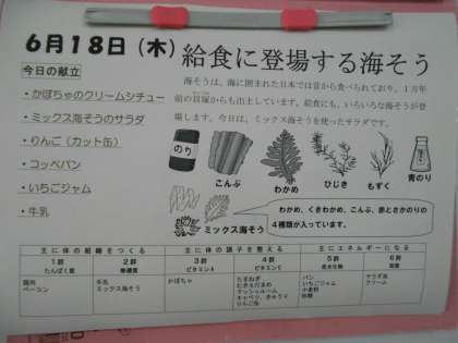 給食には、のりやわかめ、昆布、ひじき、もずくなどのいろいろな海藻が登場します。本日のサラダでは、ミックス海藻(わかめ、くきわかめ、こんぶ、赤とさかのりの4種類)が登場です。