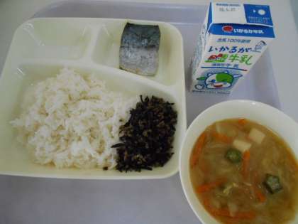 本日の献立は、ごはん、さごしの塩焼き、みそ汁、牛肉そぼろ、牛乳です。