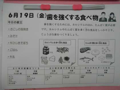 カルシウムをたくさん含んだ牛乳(毎日の給食で提供)や、たんぱく質をたくさん含んだ牛肉(本日の給食の献立の一つです)などは、歯を強くする食品です。