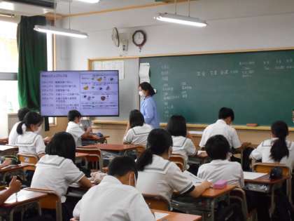 本日の5限目には、栄養教諭の奥田先生の「食育」の授業が2年1組で行われました。授業のテーマは、「朝食について考えよう」です。