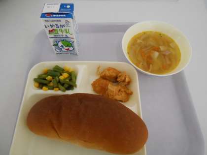 本日の献立は、黒糖パン、鶏肉のカレーマヨネーズ焼き、てぼ豆のスープ、さんどまめとコーンのサラダ、牛乳です。
