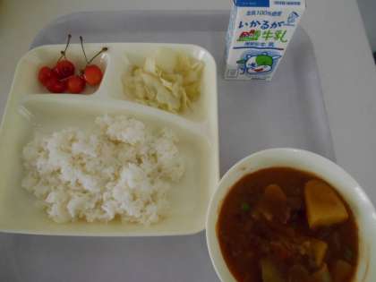 本日の献立は、ハヤシライス、キャベツのゆずドレッシング、さくらんぼ、牛乳です。