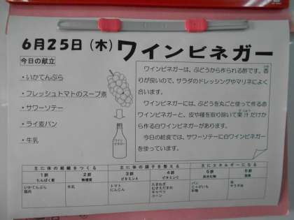 本日の給食では、サワーソテーにワインビネガーというブドウからつくられた酢を使っています。