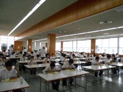 (写真は、昼食ホールでの1年生の給食の様子です。)