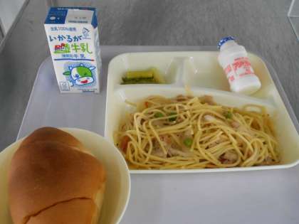 本日の献立は、1/2黒糖パン、ポークトマトスパゲッティ、グリーンアスパラガスのサラダ、発酵乳、牛乳です。