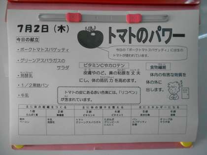 本日の「ポークトマトスパゲッティ」には、ビタミンCやカロテン、食物繊維を豊富に含んだ、生のトマトが使われています。