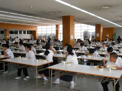 (写真は、昼食ホールでの1年生の給食の様子です。)