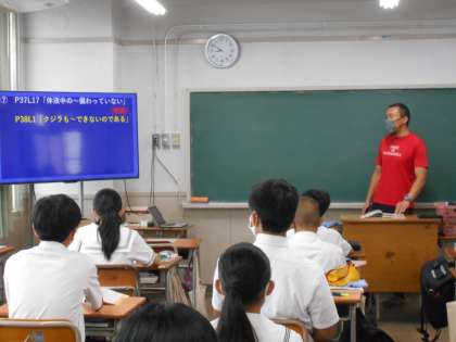 本日、1年1組で国語科金先生の研究授業を行いました。単元名は「クジラの飲み水」、説明文の学習で、序論・本論を終えて、仮設から結論にいたるまでの学習をしました。電子黒板による説明、音読、ノートのまとめを行いました。