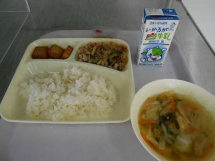 本日の献立は、ごはん、ゴーヤチャンプルー、すまし汁、厚揚げの生姜醤油かけ、牛乳です。